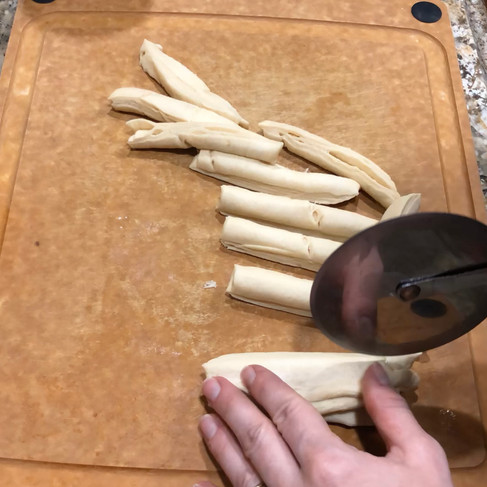 3. Unroll the second can of crescent dough. Divide it into 4 equal rectangles, then cut each into thin strips approximately 1/2 inch wide; set them aside.